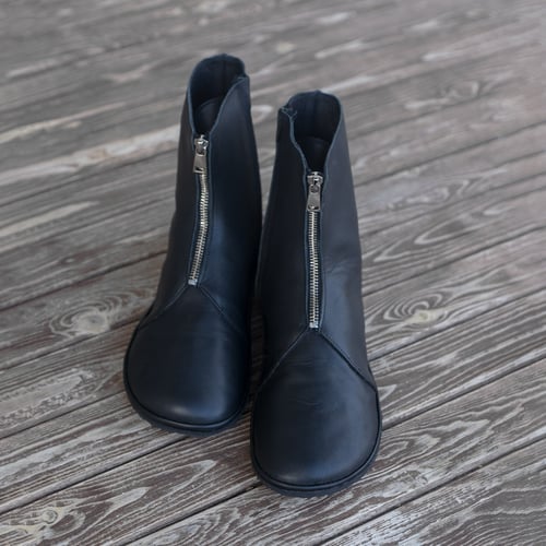 Introducing the Zephyr Boots—where sleek design meets effortless style. Crafted in rich black leather, this above-ankle boot features a striking silver zipper down the center, adding a bold, contemporary edge. For added convenience, a side zipper ensures easy wear, blending functionality with fashion. Perfect for elevating any outfit, this style seamlessly combines sophistication with modern flair.